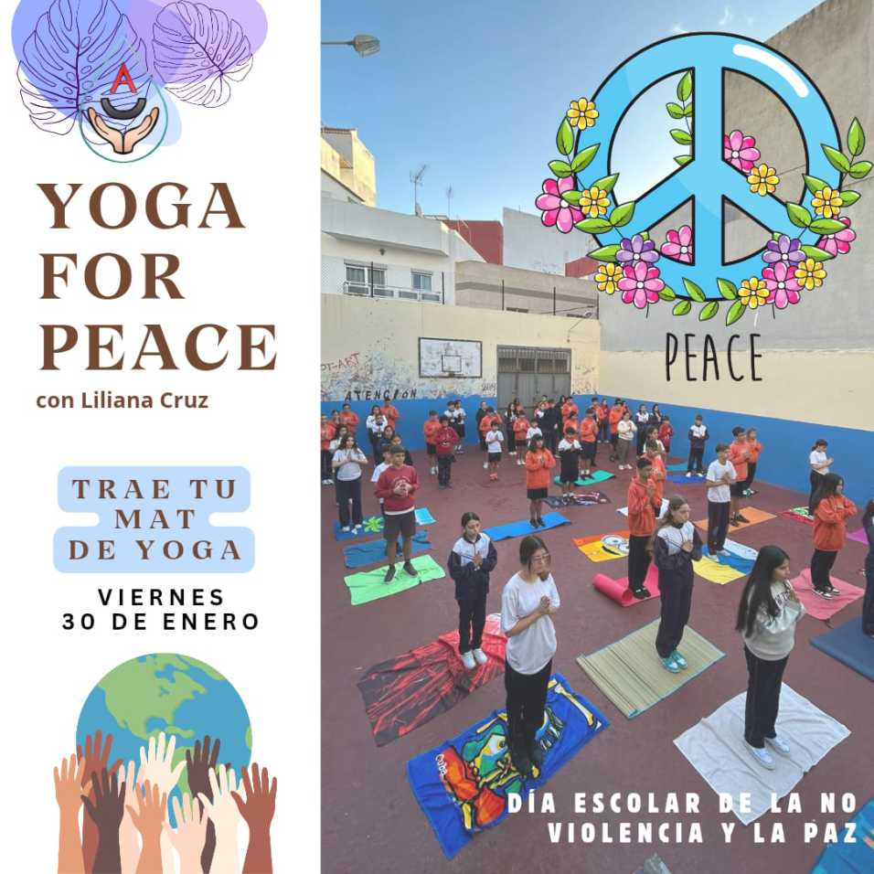 Con motivo del Día Escolar de la No Violencia y la Paz, el próximo viernes 30 de enero el alumnado participará en una práctica de yoga guiada por la profesional Liliana Cruz. Esta actividad se enmarca dentro de las acciones educativas orientadas al desarrollo de la autorregulación emocional, la atención plena y la convivencia positiva, fomentando valores como la empatía, el respeto y la cultura de paz desde una experiencia vivencial. ¡No olvides traer tu esterilla!
